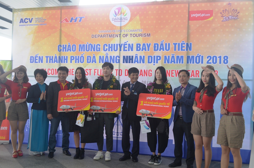 Cũng trong sáng ngày 1-1, tại Cảng hàng không quốc tế Đà Nẵng, chuyến bay mang số hiệu VJ881 từ Seoul (Hàn Quốc) do hãng hàng không Vietjet Air khai thác đã đưa hơn 220 du khách đến với thành phố biển Đà Nẵng.