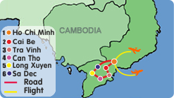 Routes: Ho Chi Minh - Cai Be – An Binh Island – Mo Cay - Tra Vinh – Tieu Can – Can Tho – Long Xuyen – Sa Dec – Ho Chi Minh